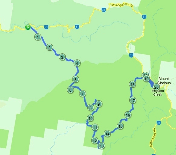 I drove to The Gap to catch the runners' chartered bus to Mt Glorious. I was expecting more runners than turned up. Others obviously decided to use private transport. The bus left at 06:05 up Waterworks Road towards Mt Nebo. I was looking forward to viewing parts of the D’Aguilar range national park on the drive up. However the bus turned left to Payne Road and I thought we’re taking the bumped-up Gap Creek Road on the edge of Mt Coot-tha. But the bus turned again and I realised finally that it was not suited to the narrower ascending and winding mountain roads and is taking the long way around, going anti-clockwise to Cedar Flats. So leaving The Gap, we go through the northwestern suburbs: Ashgrove, Bardon, Red Hill, Paddington, and Toowong. And then along the western freeway, Ipswich motorway, Warrego highway thence past Fernvale to Northbrook parkway, venue of the start line at the base of Northbrook mountain.